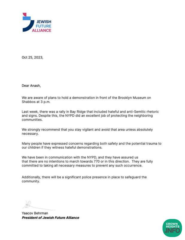 Jewish Future Alliance Notifies Community About Expected Demonstration Near Crown Heights