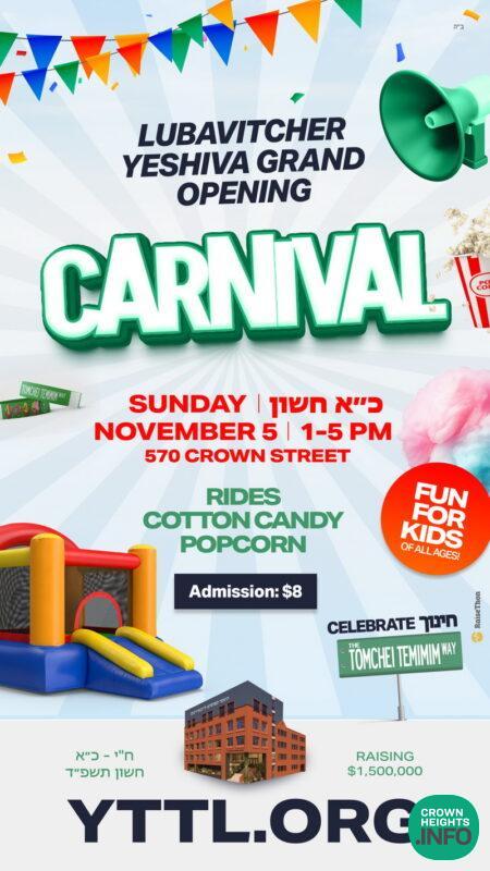 On Sunday, Chof Alef Cheshvan, Lubavitcher Yeshiva will be hosting a carnival to celebrate the grand opening of its long awaited expansion.