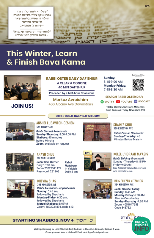 Join one of the eight daily Gemara shiurim in Crown Heights (and online) who are starting to learn Maseches Bava Kama, giving you a unique opportunity to learn Maseches Bava Kama in 80 days! Local daily Gemara Shiurim starts this Shabbos, Chof Cheshvan, Nov 3. (Rabbi Oster’s Shiur starts Maseches Bava Kama on Friday, 19 Cheshvan Nov 2).