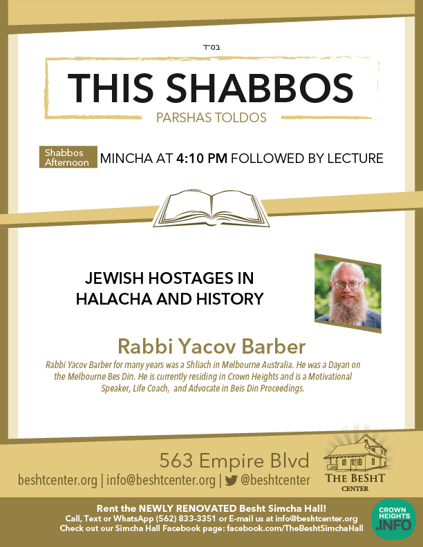 Shabbos at the BESHT: Rabbi Yacov Barber for many years was a Shliach in Melbourne Australia. He was a Dayan on the Melbourne Bes Din. He is currently residing in Crown Heights and is a Motivational Speaker, Life Coach, and Advocate in Beis Din Proceedings. He will be giving this week’s shiur on Jewish hostages in Halacha and History.