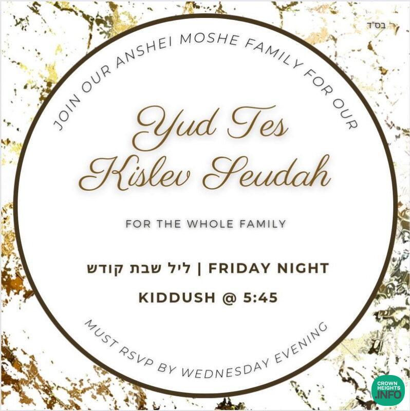 Anshei Moshe – Yud Tes Kislev Seudah, Friday Night Kiddush 5:45pm