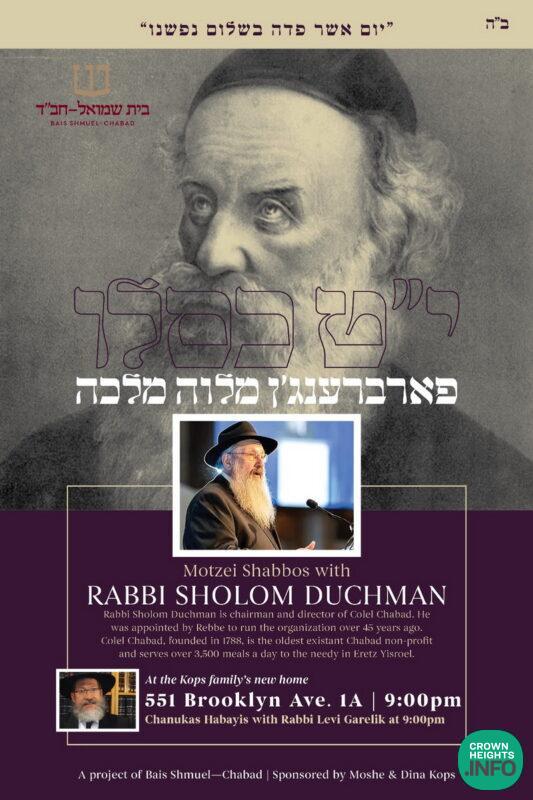 Motzei Shabbos, 9:00pm, with Rabbi Shalom Duchman