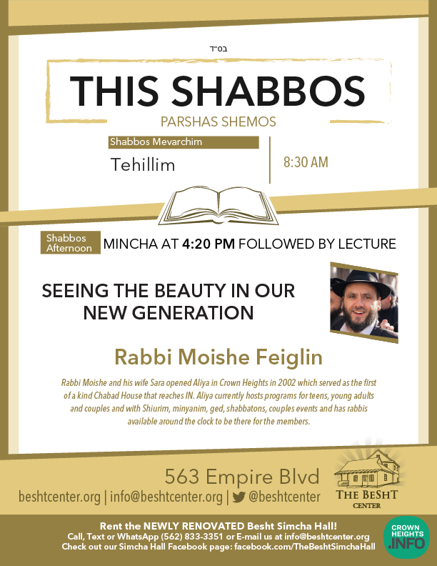 Shabbos at the BESHT: Rabbi Moishe Feiglin and his wife Sara opened Aliya in Crown Heights in 2002 which served as the first of a kind Chabad House that reaches IN. Aliya currently hosts programs for teens, young adults and couples and with Shiurim, minyanim, ged, shabbatons, couples events and has rabbis available around the clock to be there for the members. He will be giving a class on “Seeing the beauty in our new generation”.