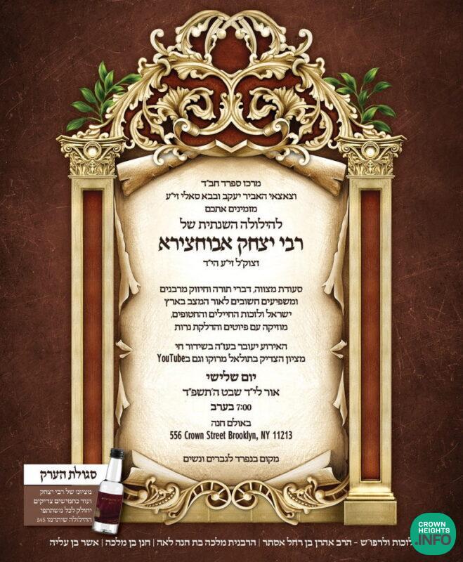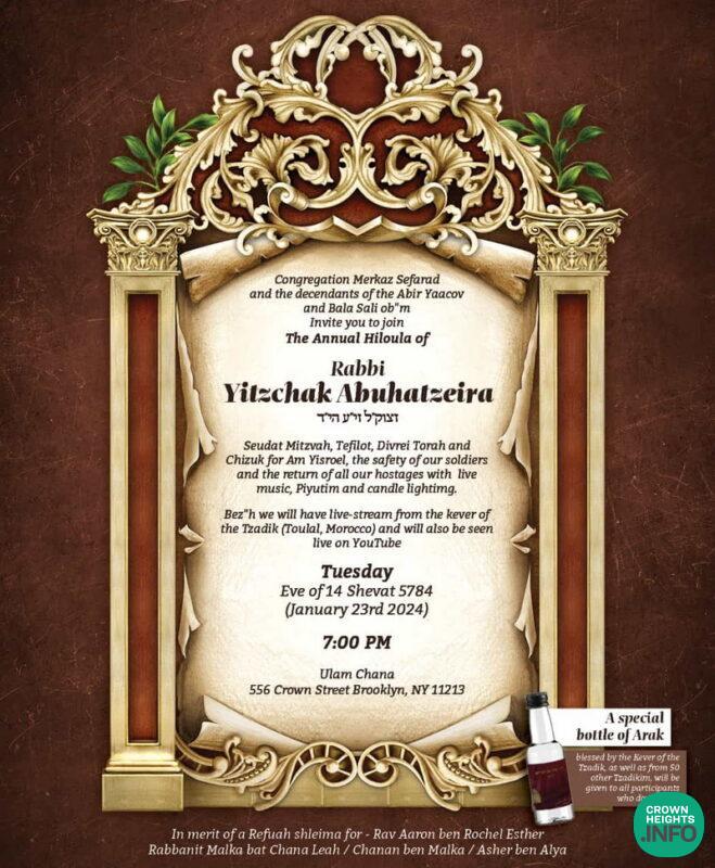 For an evening of inspiration, with Divrei Chizuk, miracle stories and to learn how to pray using the special and unique Segula in the merit of the Tzadik, Rabbi Yitzhak Abuhatzeira, join us in person at Ulam Chana, 556 Crown St, on Tuesday January 23rd, 7:00pm or watch it live YouTube.