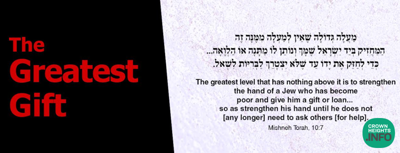 The Rambam writes, “the highest level of tzedaka that there is no higher, is a person who supports a yid who has fallen into poverty by giving him a gift…”