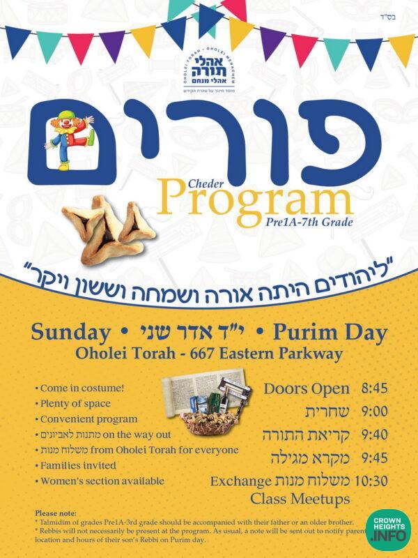 * Rebbis will not necessarily be present at the program. As usual, a note will be sent out to notify parents of location and hours of their son’s Rebbi on Purim day.
