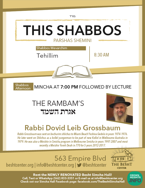 Shabbos at the BESHT: Rabbi Dovid Leib Grossbaum was sent on bochurim shlichus to Miami Beach Yeshiva Gedola in years 1974-1976. He later went on Shlichus as a kollel yungerman to be part of new Kollel in Melbourne Australia in 1979. He was also a Meishiv in Smicha program in Melbourne Smicha in years 1997-2007 and most recently a Meishiv Yoreh Deah in 770 for 5 years 2012-2017.