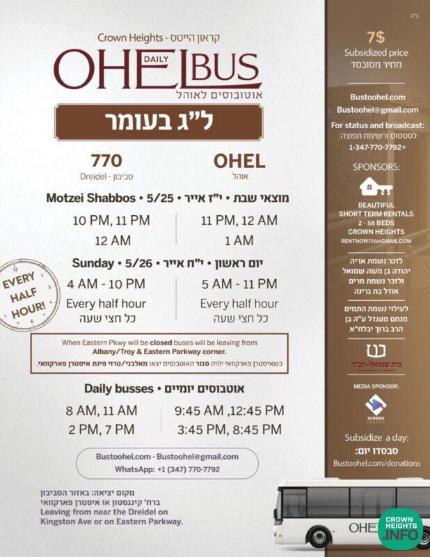 Subsidized bus service to and from the Ohel will be expanded in honor of Lag B’Omer on Motzei Shabbos, the 17th of Iyar and Sunday, the 18th of Iyar.