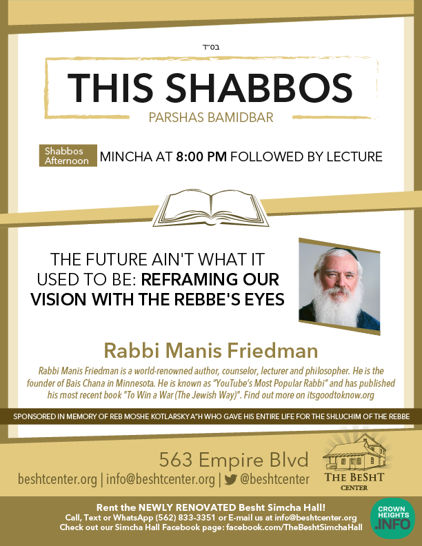 Shabbos at the BESHT: Rabbi Manis Friedman is a world-renowned author, counselor, lecturer and philosopher. He is the founder of Bais Chana in Minnesota. He is known as “YouTube’s Most Popular Rabbi” and has published his most recent book “To Win a War (The Jewish Way)”. Find out more on itsgoodtoknow.org. He will be giving this week’s lecture titled The Future Ain’t What It Used to Be: Reframing Our Vision with the Rebbe’s Eyes.