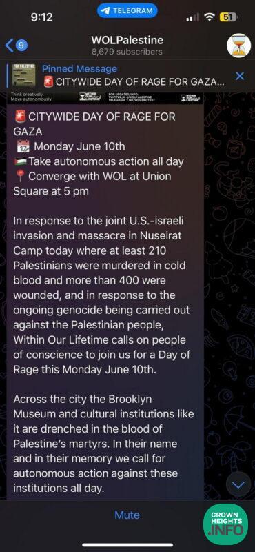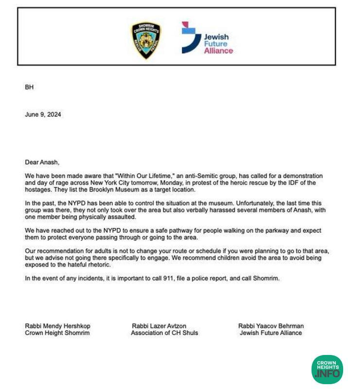 We have been made aware that “Within Our Lifetime,” an anti-Semitic group, has called for a demonstration and day of rage across New York City tomorrow, Monday, in protest of the heroic rescue by the IDF of the hostages. They list the Brooklyn Museum as a target location.