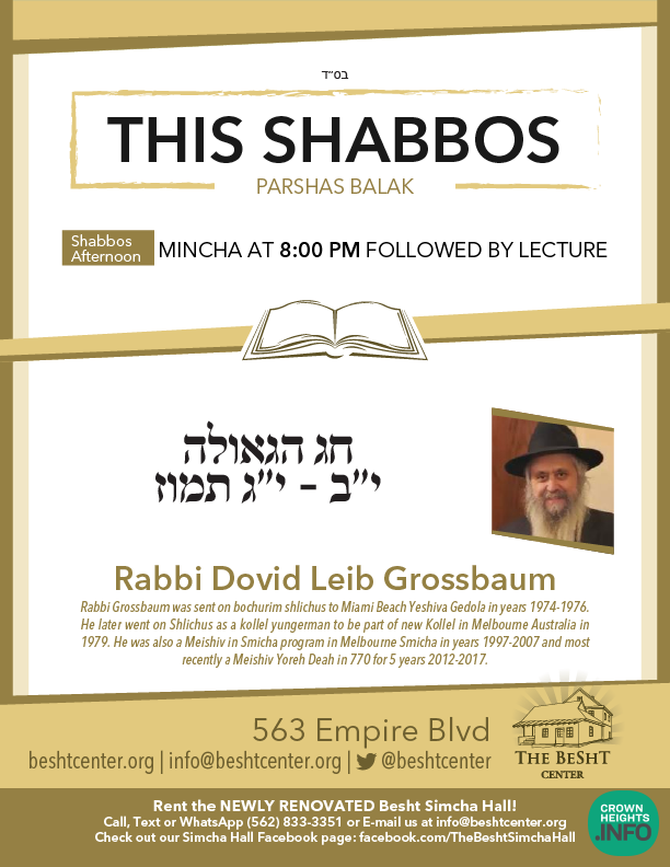 Shabbos at the BESHT: Rabbi Dovid Leib Grossbaum was sent on bochurim shlichus to Miami Beach Yeshiva Gedola in years 1974-1976. He later went on Shlichus as a kollel yungerman to be part of new Kollel in Melbourne Australia in 1979. He was also a Meishiv in Smicha program in Melbourne Smicha in years 1997-2007 and most recently a Meishiv Yoreh Deah in 770 for 5 years 2012-2017. He will be giving this week’s shiur on the Chag Hageulah: 12 – 13 Tammuz.