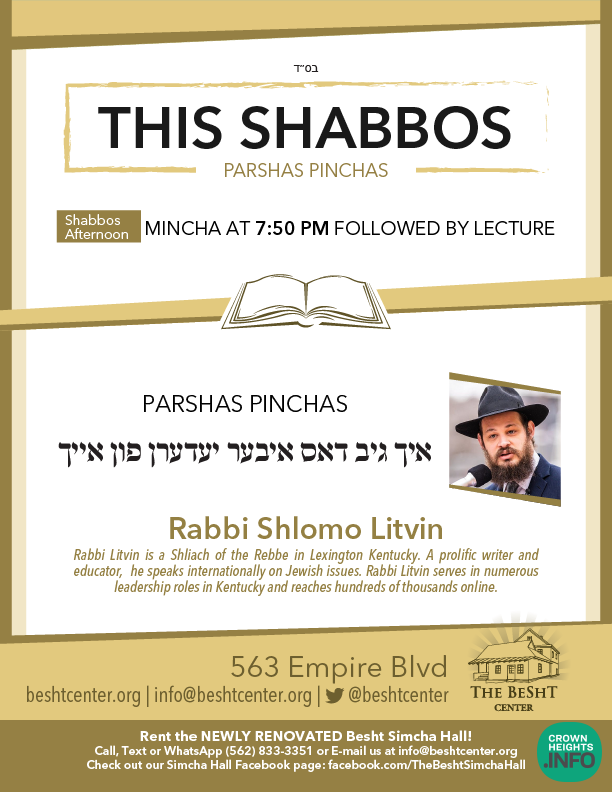 Shabbos at the BESHT: Rabbi Shlomo Litvin is a Shliach of the Rebbe in Lexington Kentucky. A prolific writer and educator, he speaks internationally on Jewish issues. Rabbi Litvin serves in numerous leadership roles in Kentucky and reaches hundreds of thousands online. he will be giving this week’s shiur on Parshas Pinchas: איך גיב דאָס איבער יעדערן פון אייך.