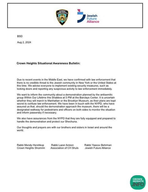 Crown Heights Shomrim and The Jewish Future Alliance Notify The Community of Shabbos Protest