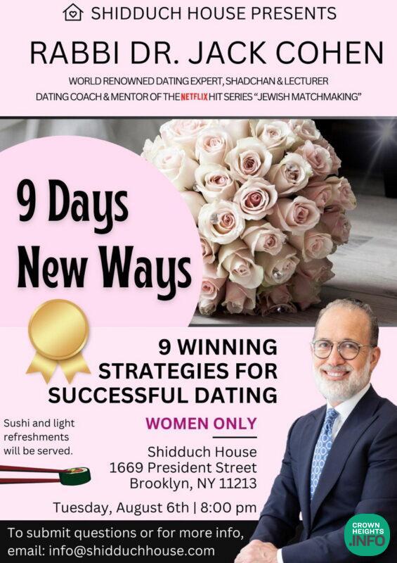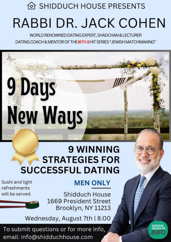 This Tuesday and Wednesday beH, The Shidduch House will be hosting two back to back events with Rabbi Dr. Jack Cohen, an expert in the field of shidduchim. Dr. Cohen is a well renowned dating coach, shadchan and lecturer and he will be sharing 9 winning strategies for successful dating.
