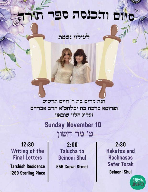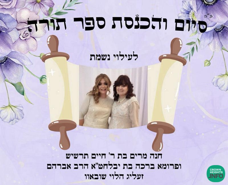 The Tarshish and Shubov families have invited the Crown Heights community to join them for a Siyum and Hachnasas Sefer Torah in memory of Chana Miriam Tarshish OBM and Fruma Bracha Shubov OBM.