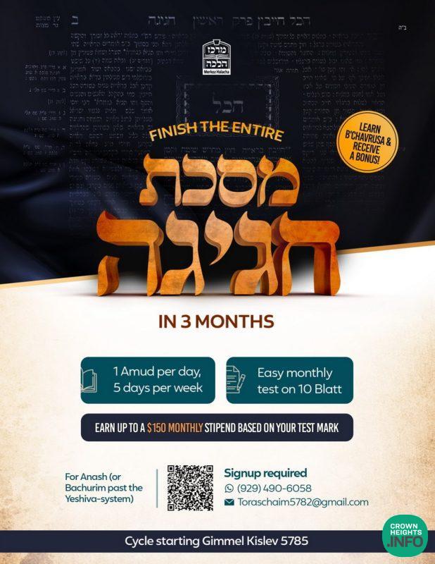 The Toras Chaim – Gemara program (a project of Merkoz-Halacha) will be starting a new Masechta on Wednesday, Gimmel Kislev. Join this cycle and finish Maseches Chagiga in just three months. It’s an easy 1 Amud/day, 5 days a week.