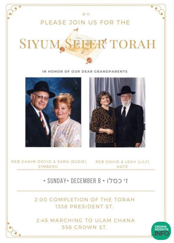 A Sefer Torah will be welcomed in Crown Heights this coming Sunday, December 8th, in honor of Reb Chaim and Sara Zimberg, and Reb Dovid and Leah Katz.