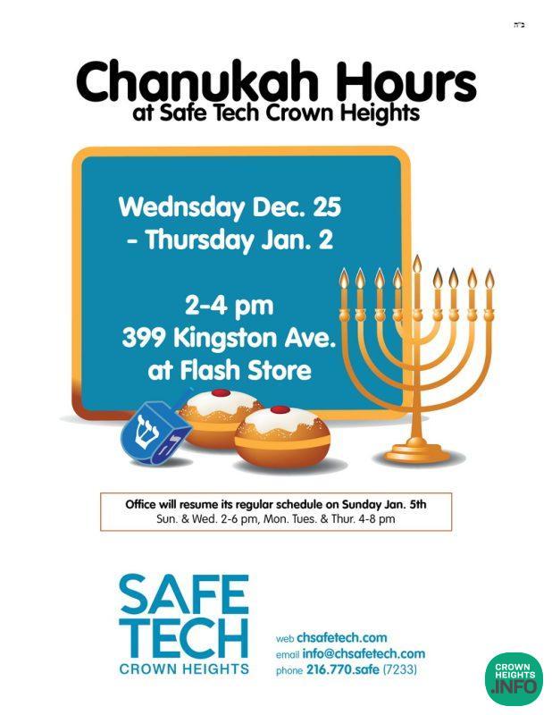 Safe Tech Crown Heights will operate daily with modified hours during Chanukah to serve students and visitors. From 24 Kislev (December 25) through 2 Teves (January 2, 2025), the office at 399 Kingston Ave. (inside the Flash store) will be open from 2-4 PM.