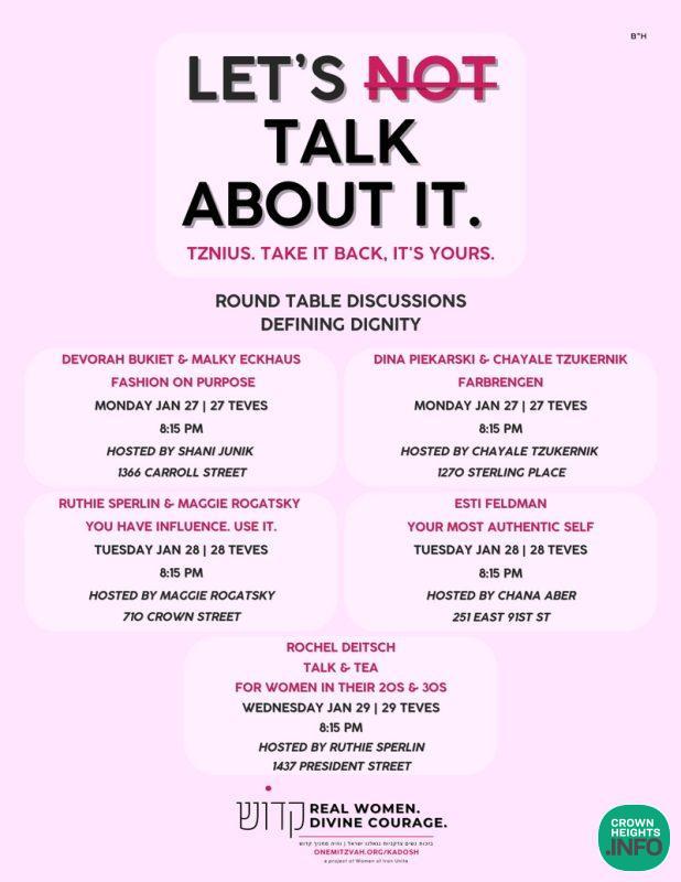 As we move forward, we are excited to announce what’s next: Round Table Talks. Featuring dynamic speakers, with diverse perspectives. Choose the one that speaks to you and venture out for an evening of growth and connection, where you can listen and learn and internalize what Tznius means to you and then make it relevant to your daily life. You never know, your small step may inspire someone else.