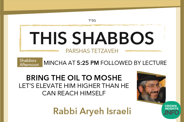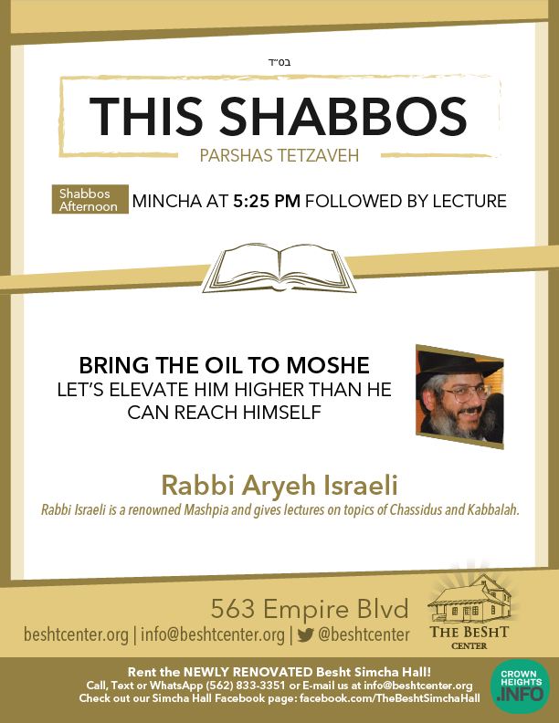Shabbos at the BESHT: Rabbi Aryeh Israeli is a renowned Mashpia and gives lectures on topics of Chassidus and Kabbalah. He will be giving this week’s shiur on the topic of “Bring the oil to Moshe: Let’s elevate him higher than he can reach himself”.