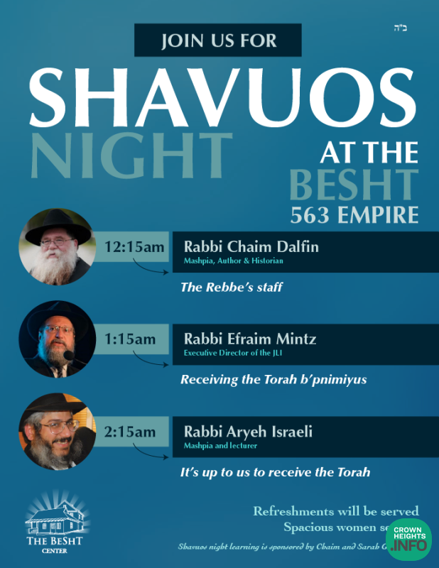 As is the custom, Shiurim, learning, and lectures will be taking place throughout the night at The BESHT Center in Crown Heights on the first night of Shavuos.