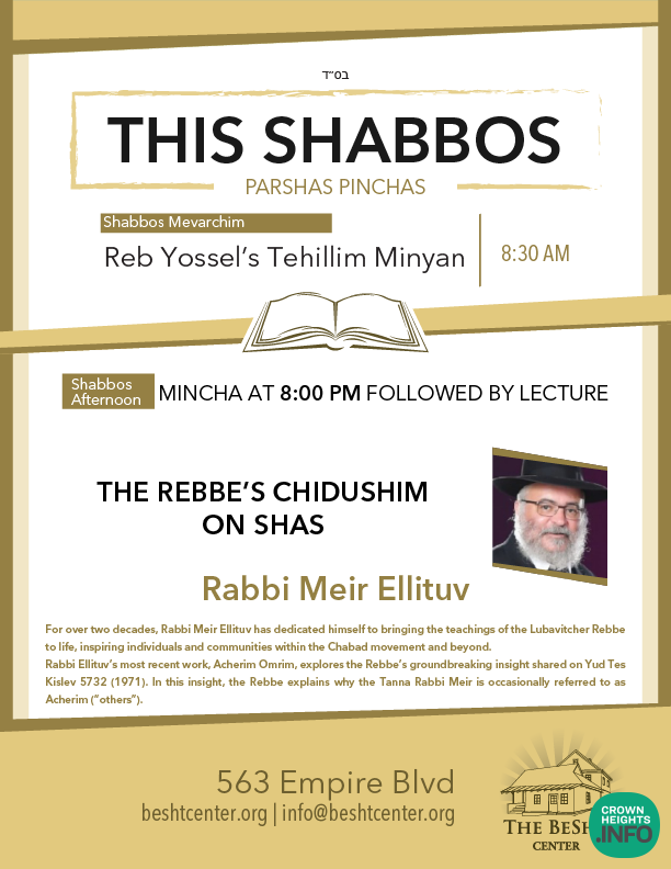 Shabbos at the BESHT: For over two decades, Rabbi Meir Ellituv has dedicated himself to bringing the teachings of the Lubavitcher Rebbe to life, inspiring individuals and communities within the Chabad movement and beyond. He will be giving this week’s Shiur on The Rebbe’s chidushim on shas.