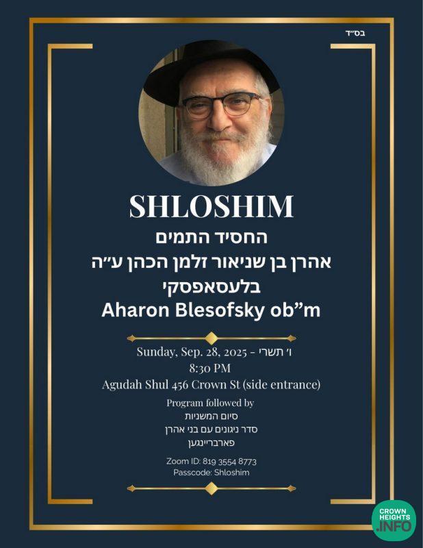 A Shloshim event will be taking place in Crown Heights this Sunday in memory of Reb Aharon Blesofsky OBM.