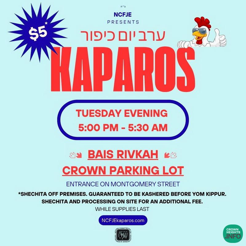 Kaparos begins at 5:00 PM, with shechita beginning at 9:00 PM.