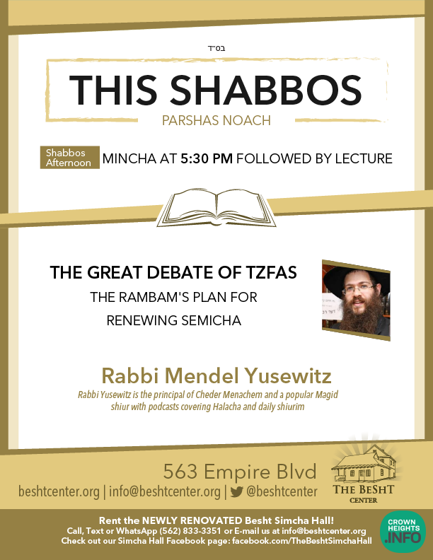 Shabbos at the BESHT: Rabbi Mendel Yusewitz is the principal of Cheder Menachem and a popular Magid shiur with podcasts covering Halacha and daily shiurim . He will be giving this week’s shiur on The Great Debate of Tzfas: The Rambam’s plan for Renewing Semicha.