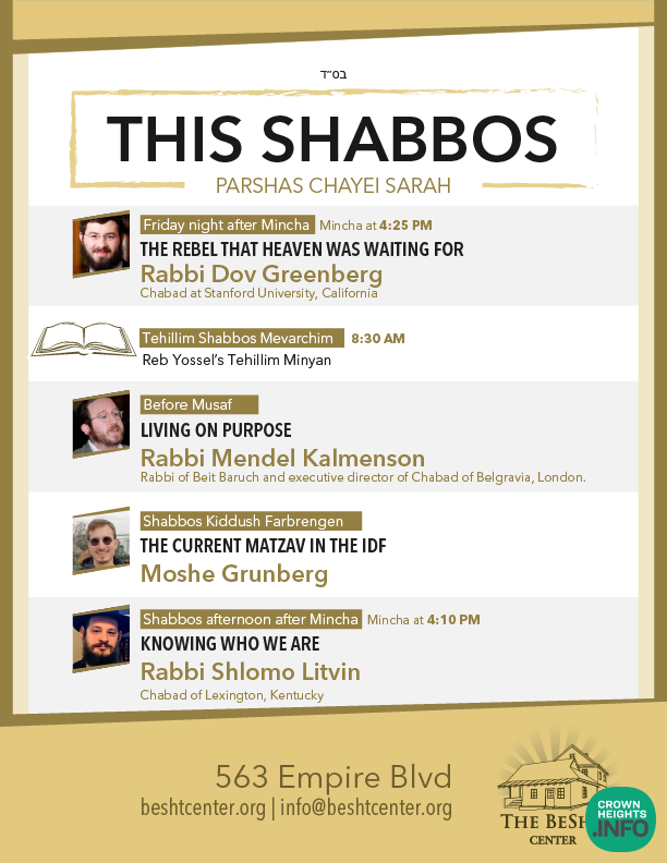 BESHT: Chayei Sarah Shabbos at the BESHT: Rabbi Dov Greenberg, Rabbi Mendel Kalmenson, Moshe Grunberg, and Rabbi Shlomo Litvin will be speaking at the BESHT this week.