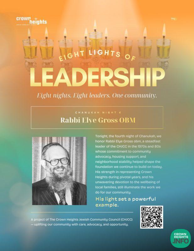 As part of our Chanukah campaign, Eight Nights. Eight Leaders. One Community., we honor Rabbi Elye Gross obm, whose leadership helped shape the CHJCC in its formative years, guided by care for people, quiet strength, and devotion to Crown Heights.