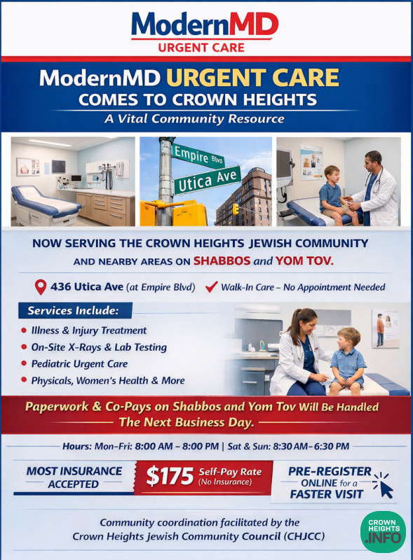 The Crown Heights Jewish Community Council (CHJCC) today announced the availability of a new urgent care resource for the Crown Heights community, responding directly to concerns raised at the recent Community Town Hall regarding access to medical care, especially during off-hours and Shabbos and Yom Tov.