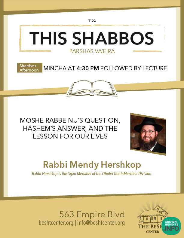 Shabbos at the BESHT: Rabbi Mendy Hershkop is the Sgan Menahel of the Oholei Torah Mechina Division. He will be giving this week’s Shiur on Moshe Rabbeinu’s Question, Hashem’s Answer, and the Lesson for Our Lives.
