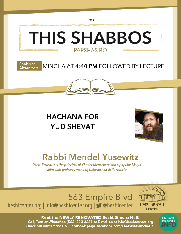 BESHT: Hachana for Yud Shevat Shabbos at the BESHT: Rabbi Mendel Yusewitz is the principal of Cheder Menachem and a popular Magid shiur with podcasts covering Halacha and daily shiurim. He will be giving this weeks shiur on Hachana for Yud Shevat.