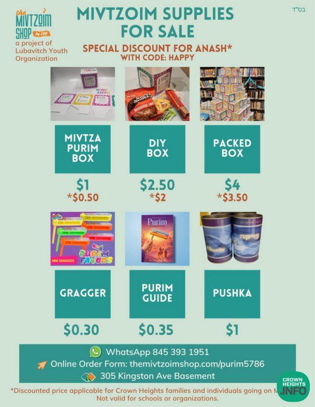 10:00-11:00 AM & 12:00-2:00 PM – The Mivtzoim Shop, at 305 Kingston Ave, will be open for purchasing Purim Mivtzoim Supplies
