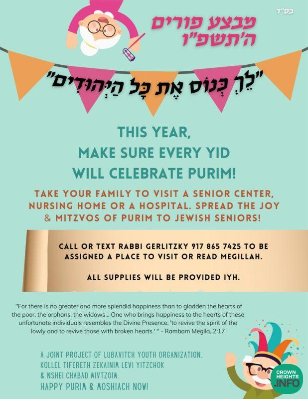 Families, this is for you! Take your family to spread the Purim joy to Jewish seniors! Call or text Rabbi Gerlitzky at (917) 865-7425 to be assigned a place to visit or read the Megillah. All supplies will be provided IYH.