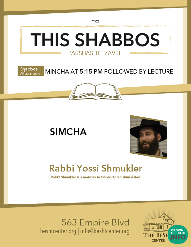 BESHT: Simcha Shabbos at the BESHT: Rabbi Yosef Shmukler is a meishev in Oholei Torah shiur daled. He will be giving this week’s Shiur on Simcha.