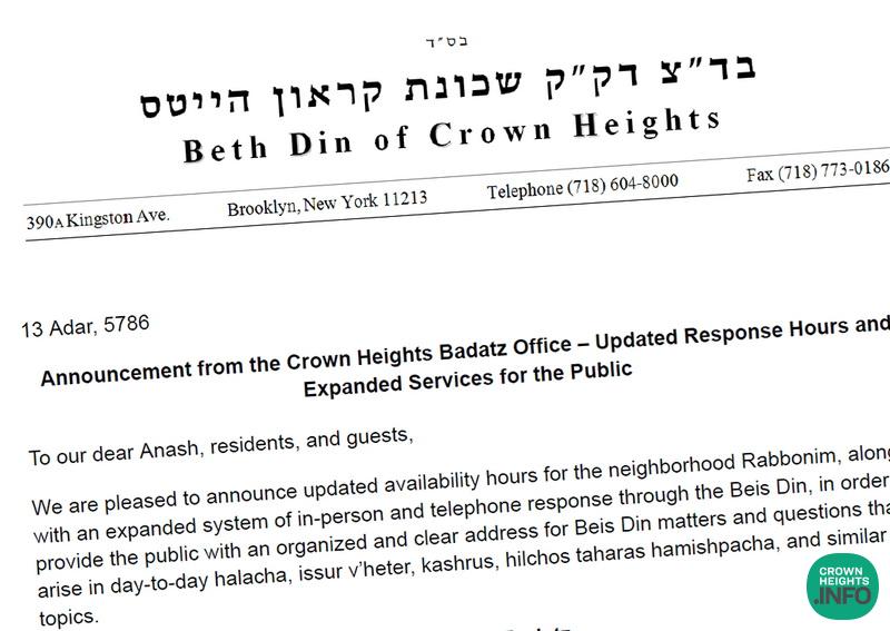 An important public notice from the Crown Heights Badatz (in Hebrew and English) was released today regarding updated response hours and the expansion of Beis Din services.