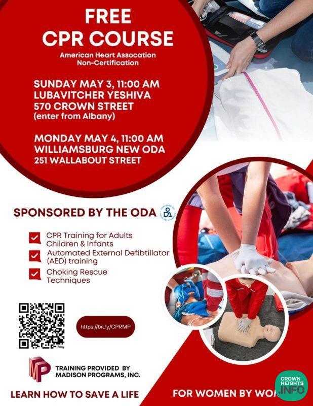 Residents of Crown Heights will soon have an important opportunity to gain lifesaving skills, as a free CPR training course is set to take place for women at Lubavitcher Yeshiva Crown Street.