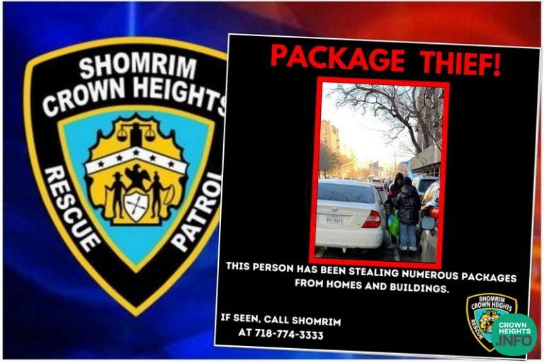 Crown Heights Shomrim has published an alert to the community advising of a new package thief that has come to town and has been caught shopping on the communities porches and buildings.