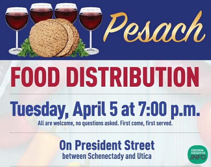 F.R.E.E. NYC will be distributing kosher l’pesach food for Crown Heights families today on President between Schenectady and Utica beginning at 7:00 PM.
