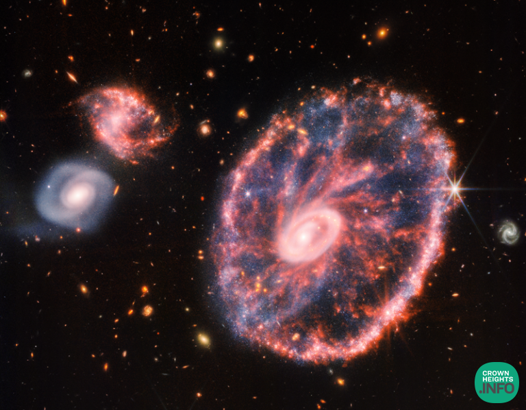 NASA’s James Webb Space Telescope has peered into the chaos of the Cartwheel Galaxy, revealing new details about star formation and the galaxy’s central black hole. Webb’s powerful infrared gaze produced this detailed image of the Cartwheel and two smaller companion galaxies against a backdrop of many other galaxies.