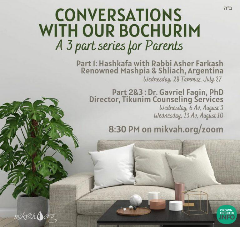 Mikvah.org is hosting a three part series for parents, titled “Conversations with your Bochurim”. Part two will be tonight Wednesday, 6 Av, August 3rd, with Dr. Gavriel Fagin PhD, Director Tikunim Counseling Services.
