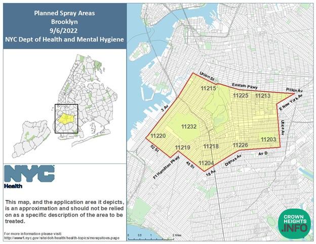 To reduce mosquito activity and the risk of West Nile virus, the New York City Health Department will spray for mosquitos in Crown Heights on Wednesday, September 7th, 2022.