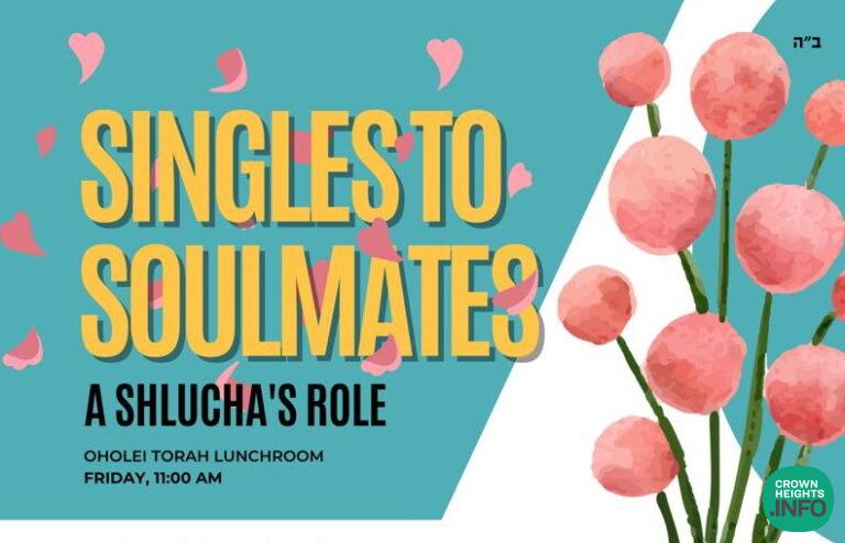 Shluchos are invited to attend a special workshop entitled “Singles to Soulmates, a Shlucha’s role.” The workshop hopes to empower Shluchos who may be looking for advice and guidance on how to approach the sensitive subject.