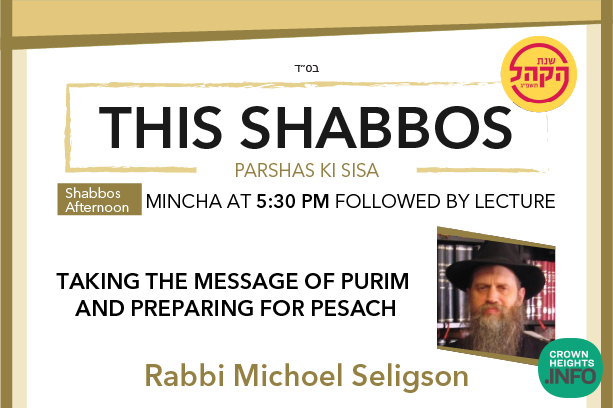 Shabbos at the BESHT: Rabbi Rabbi Michoel Seligson will be giving this week’s shiur on Taking the message of Purim and preparing for Pesach.
