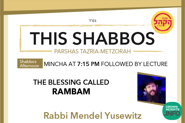 Rabbi Mendel Yusewitz is a Mechanech, Magid Shiur, Director of ‘Machon Taharas Habayis’, and Menahel of Cheder Ohr Menachem in Crown Heights. He will be giving this week’s lecture titled “The blessing called Rambam.”