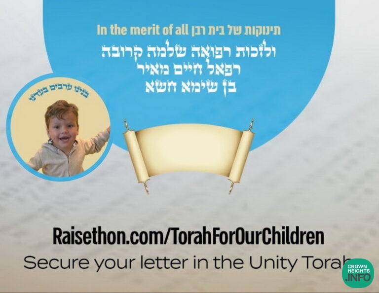 Following an unthinkable tragedy, little Raphael Chaim Meir is fighting for his life. Today, in the merit of all Jewish children, we are commencing the writing of a Torah, which will serve to safeguard the children, just as the children have committed to safeguard the Torah.