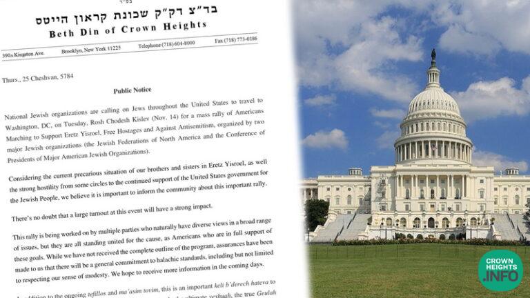 In a surprise move that shows the unity sweeping through the Jewish community, the Crown Heights Bais Din released an uncommon letter encouraging a massive rally planned for November 14th in Washington DC.