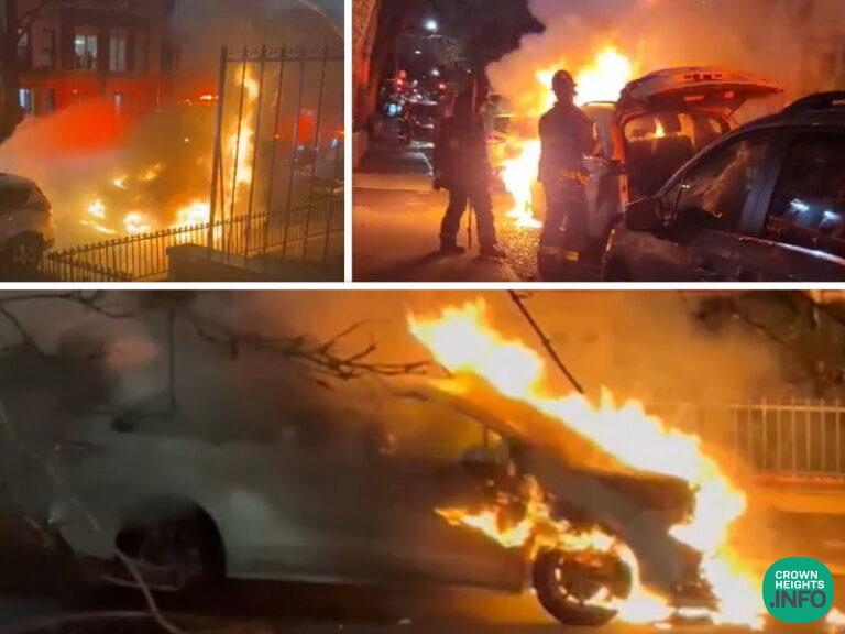 A minivan rented by a Jewish person in Crown Heights went up in flames Tuesday evening, sending flames billowing tens of feet in the air and belching smoke across the neighborhood.
